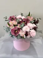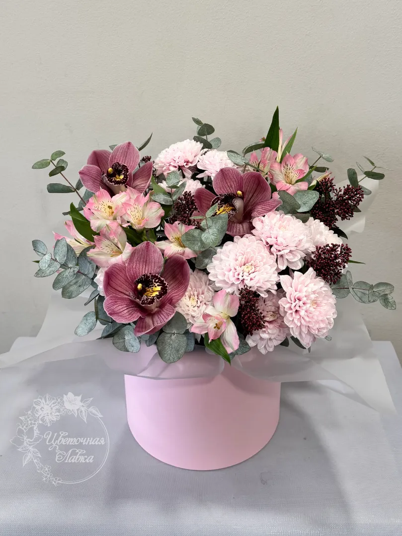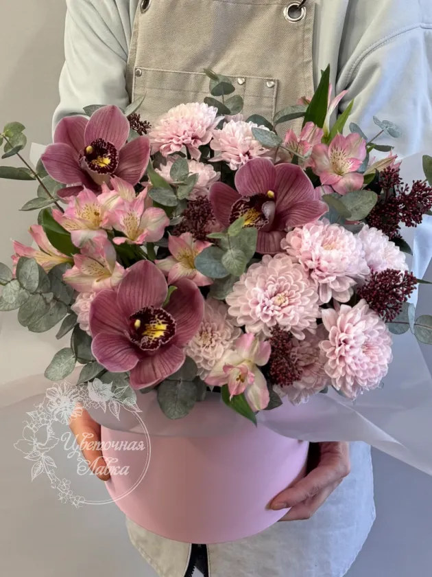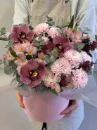 Все филиалыКомпозиция в шляпной коробке с орхидеями