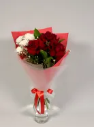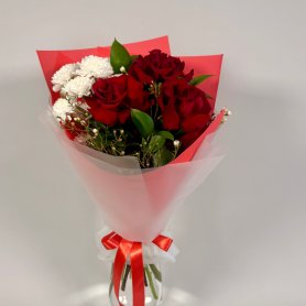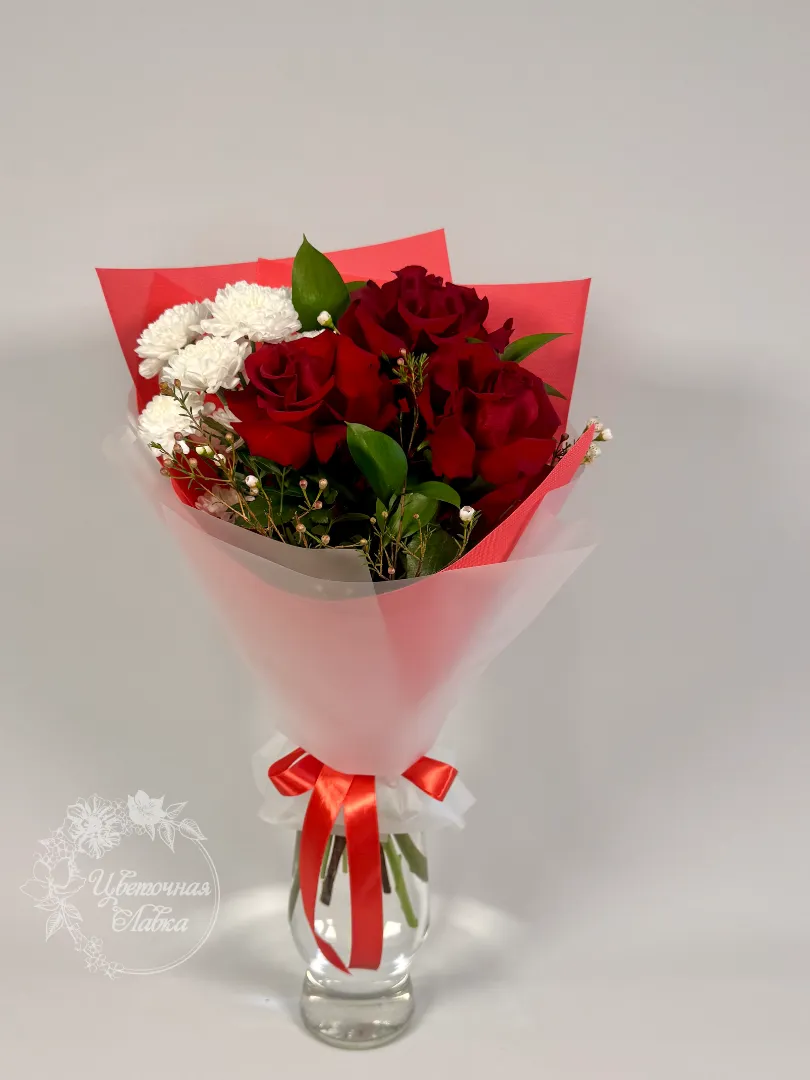 Букет «Подари мне поцелуй» — это изысканное сочетание нежных и ярких цветов, созданное для особых моментов. В его составе прекрасно гармонируют розы, выразительные кустовые хризантемы и изящные хамелациумы, подчеркивающие романтическую атмосферу. В букет добавлены фисташка и рускус, которые придают композиции свежести и натуральной красоты. Для долговечности и сохранения красоты цветов использованы материалы из фоамирана и корейской пленки. Букет украшен элегантной лентой, которая подчеркивает его торжественность. Каждый элемент композиции тщательно продуман и создан с любовью, чтобы подчеркнуть особенность вашего подарка. Этот букет станет прекрасным выражением чувств и оригинальным презентом для любимого человека. Оформление выполнено с вниманием к деталям, чтобы порадуовать глаз и тронуть сердце.